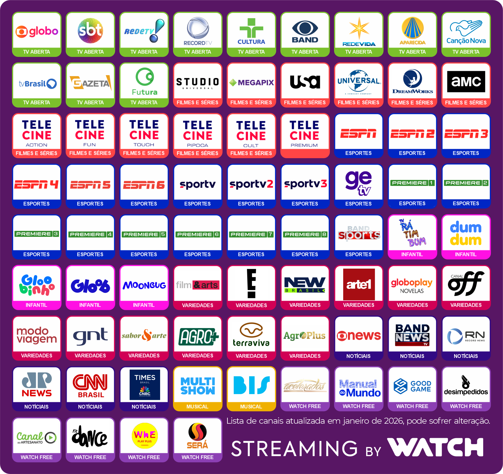 O app Watch reúne um catálogo completo de filmes, séries, desenhos, realities, canais ao vivo, esportes, notícias, conteúdos infantis, educativos e muito mais. São títulos de grandes estúdios e emissoras nacionais e internacionais, organizados em uma plataforma feita para entregar a melhor experiência de entretenimento.