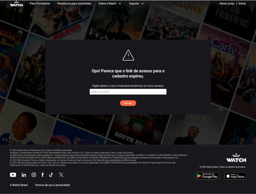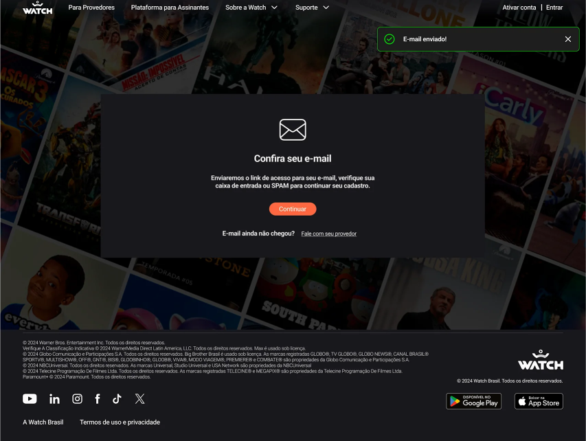 Caso não tenha localizado o e-mail na sua caixa de entrada, em https://play.watch.tv.br/ative, digite o endereço cadastrado no provedor de internet e clique em ‘Enviar para o e-mail’ para reenviar o link de ativação.