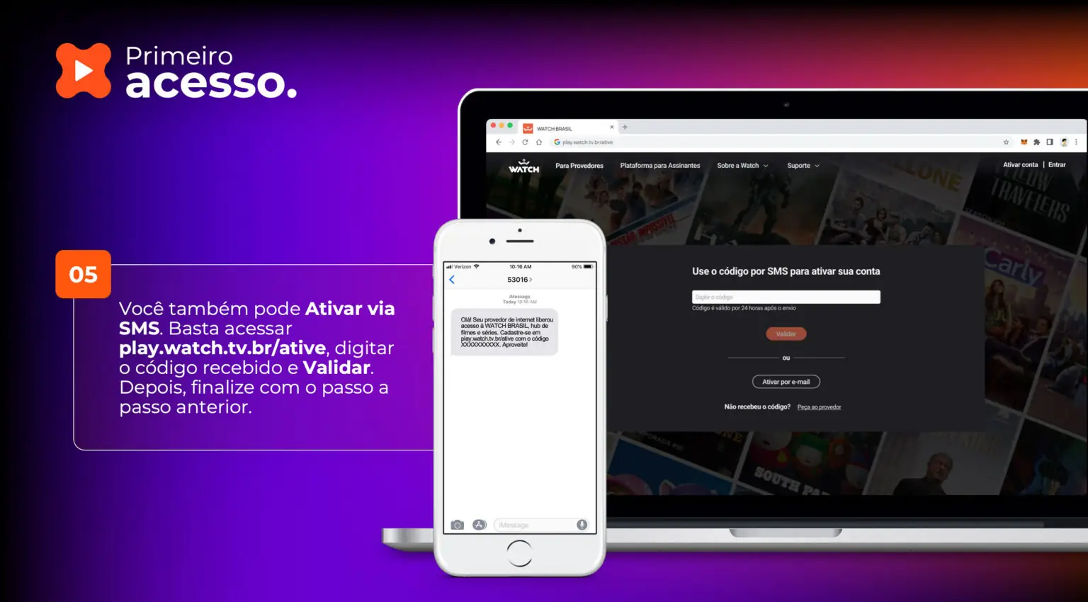Acesse https://play.watch.tv.br/ative e digite o código recebido. Depois é só validar. Ou clique em “Ativar SMS” no canto direito superior da sua tela inicial.